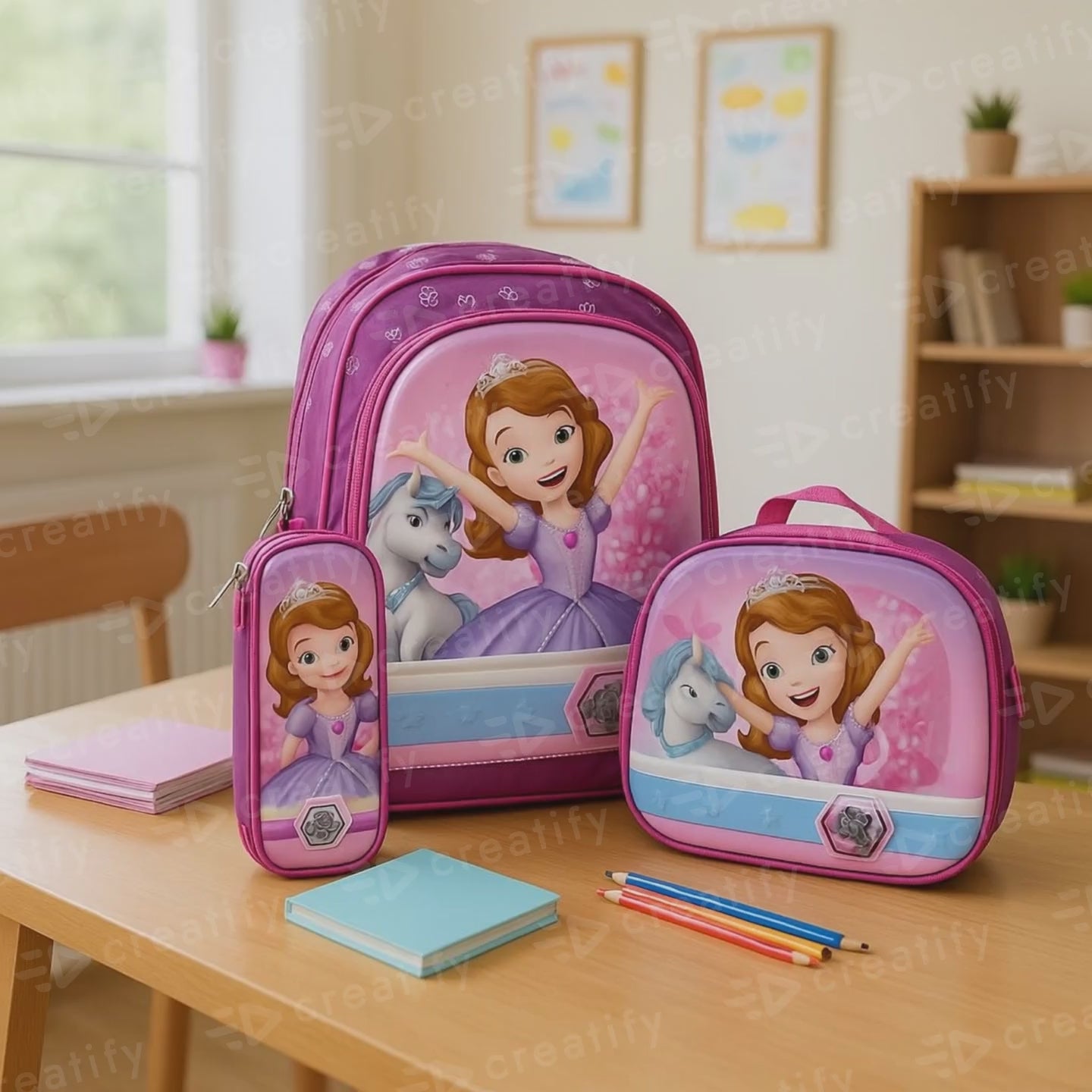طقم حقيبة أميرة 3 قطع: حقيبة ظهر، حقيبة طعام، ومقلمة. مثالي للمدرسة أو السفر!