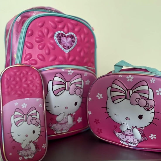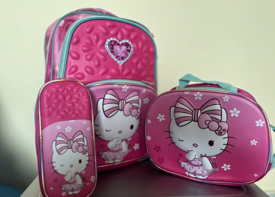 Cute 3-piece Hello Kitty backpack set with backpack, lunch bag, and pencil case. Perfect for school or travel!